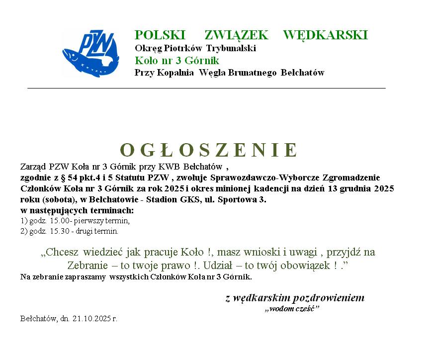 Do dnia 15.10.2025r. można uiścić opłatę PZW za sezon 2025r.